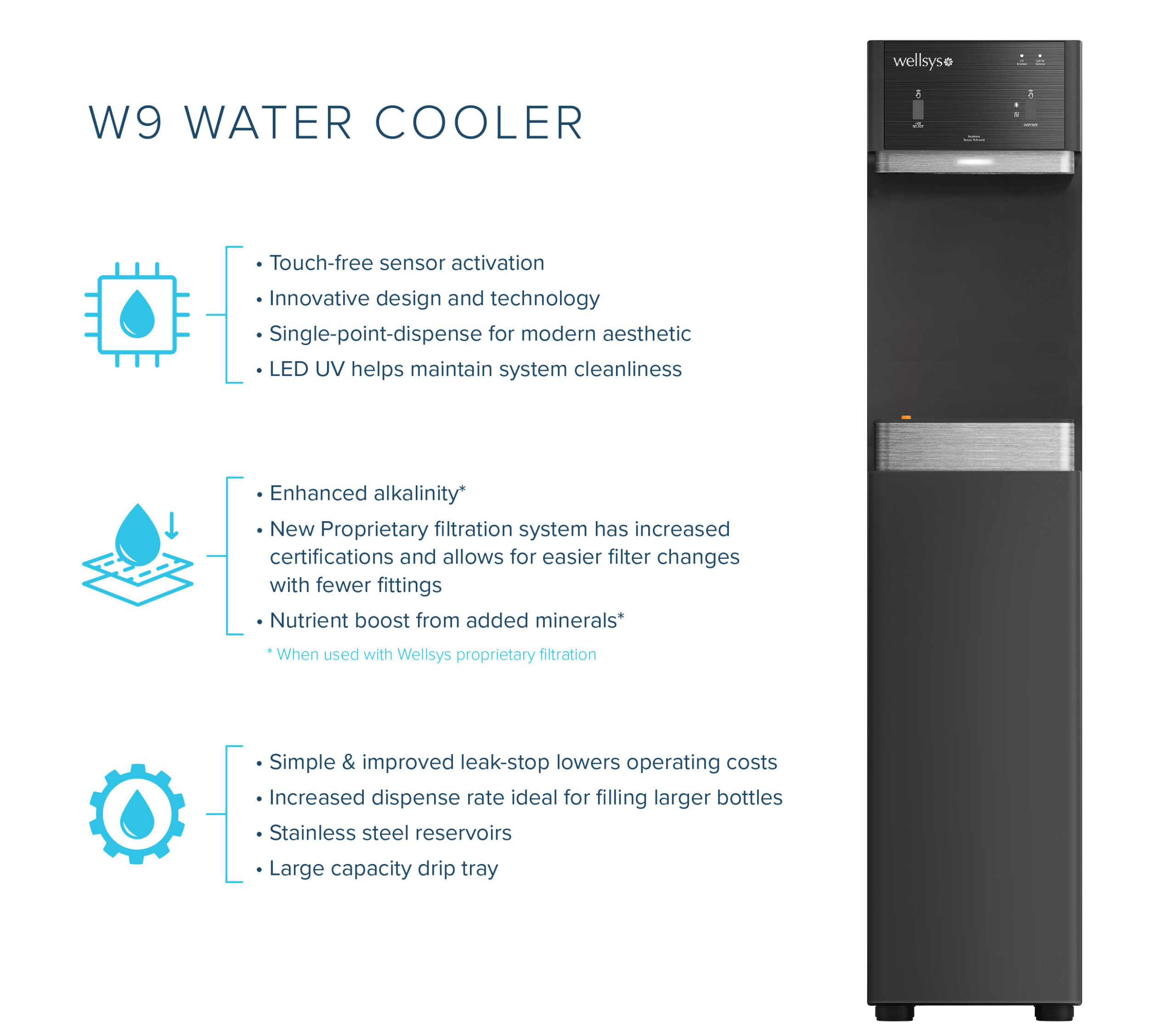- Best-Tasting, Healthiest Water Available: Through a proprietary reverse osmosis purification process, Wellsys bottleless water coolers reduce sediments, such as rust, dust, clay, and pipe residue, from your existing taps to provide healthy, lean water for your staff, vendors, and customers.